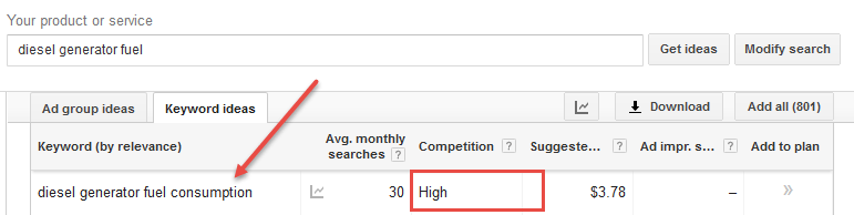 Yo empiezo buscando ideas de palabras long tail en el Autocompletar. Escribiendo algunas de las keywords primarias de mi cliente hasta que me topo con una que llame mi atención en particular – diesel generator fuel consumption.