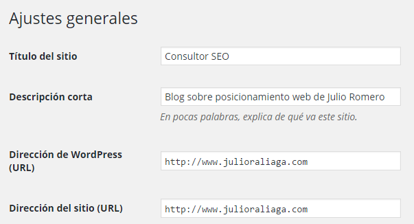El primer aspecto a tener en cuenta en WorPress es el título que damos a nuestra web. En ajustes generales: